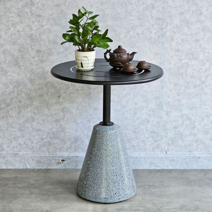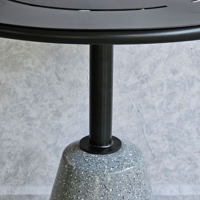 Bàn cafe chân trụ bê tông mài bóng kết hợp trụ sắt, mặt bàn sắt dập nguyên tấm, bo viền 2cm giúp cho cạnh bàn mềm mại và tránh gây trầy xước cho người dùng, mặt bàn chạy cnc khoét rảnh trang trí đơn giản tạo điểm nhấn cho sản phẩm, cấu tạo tách biệt gồm hai phần mặt bàn và chân bàn, liên kết bắt vít tiện lợi giúp vận chuyển số lượng lớn dễ dàng hơn.