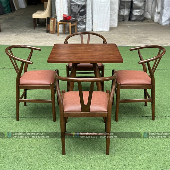 Ghế Wishbone bọc đệm simili pu bóng kết hợp với bàn gỗ caosu giá rẻ.