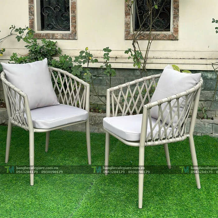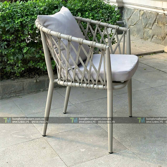 - Khung hợp kim nhôm mang đến vẻ đẹp tinh tế và hiện đại cho không gian cafe ngoài trời. Với thiết kế uốn lượn mềm mại nhẹ nhàng với các góc cạnh ghế được bo tròn. Bàn ghế với khung hợp kim nhôm tạo nên sự sang trọng và thu hút cho khách hàng. ghế được đan dây dù thủ công rất đẹp mang nhiều phong cách nghệ thuật thủ công đan lát truyền thống.