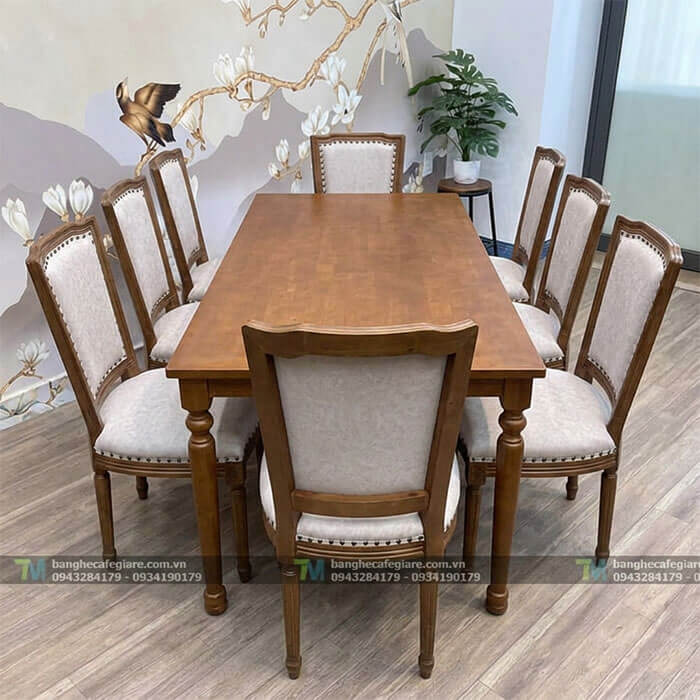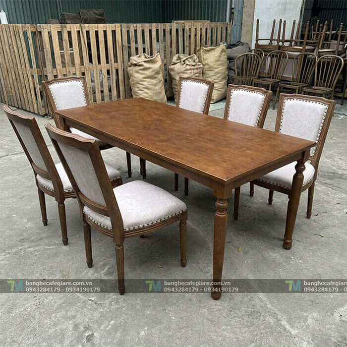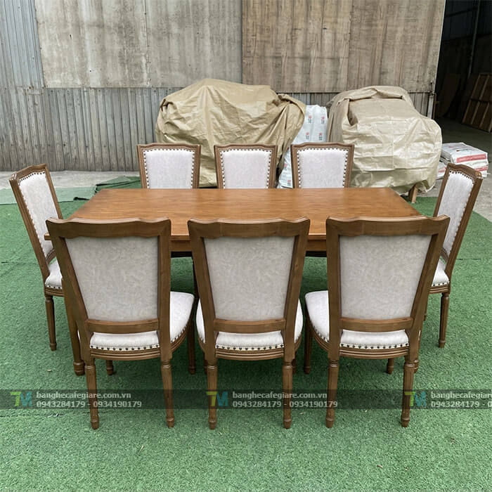 Đi kèm với những chiếc ghế Louis tinh xảo là mẫu bàn gỗ đồng bộ, mang lại sự cân bằng hoàn hảo cho tổng thể không gian.