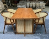 - Chân bàn độc đáo kết hợp đan mây nhựa: Đây là chi tiết đắt giá nhất của mẫu bàn năm 2026. Phần chân bàn không chỉ là những thanh gỗ đơn điệu mà được kết hợp đan mây nhựa bên dưới, tạo thành một hệ chân vững chãi và cực kỳ hút mắt. Thiết kế này không chỉ giúp bàn vững chắc mà còn tạo nên sự riêng tư kín đáo cho thực khách dưới gầm bàn.