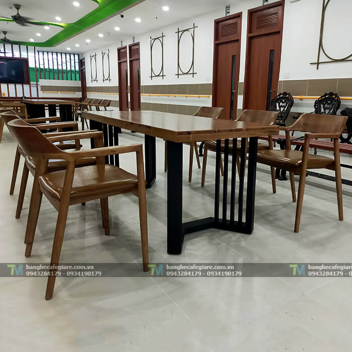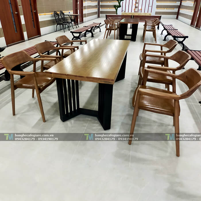 Sản phẩm bàn ghế cafe dài với mức giá thành tối ưu, thiết kế sang trọng, chất lượng bền bỉ tuổi thọ sử dụng trung bình lên đến trên 3năm, mặt bàn gỗ caosu phủ ash cho vân gỗ rất đẹp, được nẹp giả dày 5cm. Giúp mặt bàn trông dày dặn cứng cáp. Chân sắt hộp 4x8cm, dày 1.2li có kết cấu chắc chắn, giúp sản phẩm ổ định, không rung lắc khi sử dụng.
