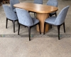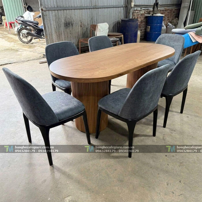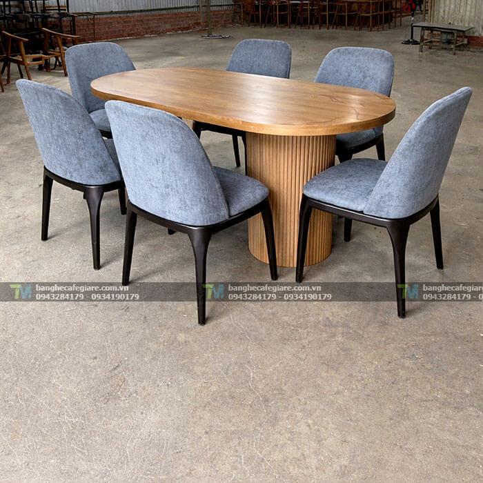 - Kiểu dáng mặt bàn linh hoạt: Hình ảnh bộ bàn Grace với mặt bàn oval lớn cho phép phục vụ nhóm khách đông người, tạo cảm giác quây quần nhưng vẫn rất sang trọng.