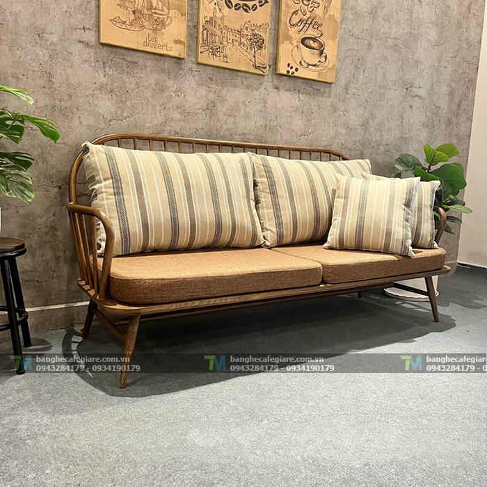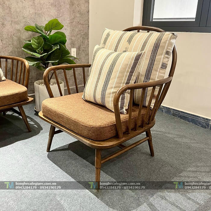 Về thiết kế, bàn ghế sofa gỗ decor có kiểu dáng hiện đại, sang trọng và màu sắc tuỳ chọn khác nhau, đáp ứng nhu cầu của từng quán cafe và phong cách thiết kế nội thất khác nhau. Phần khung ghế có chất liệu gỗ ash thuộc nhóm gỗ sồi rất được ưa chuộng làm chất liệu chính trong bàn ghế nội thất bởi khả năng bám dính keo tốt, dễ thi công sản xuất, màu sắc vân gỗ tự nhiên rất đẹp. Ghế sofa gỗ decor được cách điệu bởi các nan gỗ đan dọc phần tựa lưng ghế, mê ngồi và tựa lưng có gối đệm màu sắc và chất liệu tuỳ chọn giúp người ngồi cảm thấy dễ chịu và thư giản. Lưng tựa được uốn cong theo hình nan quạt rất tinh tế, phần tay ghế được uốn cong nhẹ cho sản phẩm mềm mại hơn và giúp người ngồi cảm thấy thích hơn.