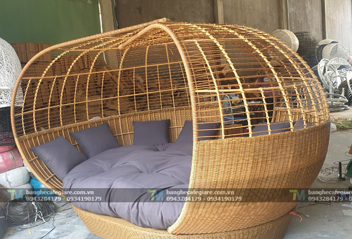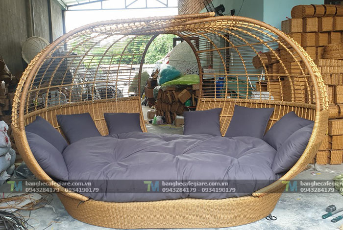 Ghế xích đu nhựa giả mây TM-20 mô phỏng hình quả bí độc đáo với 2 lớp mái đan xen nghệ thuật.